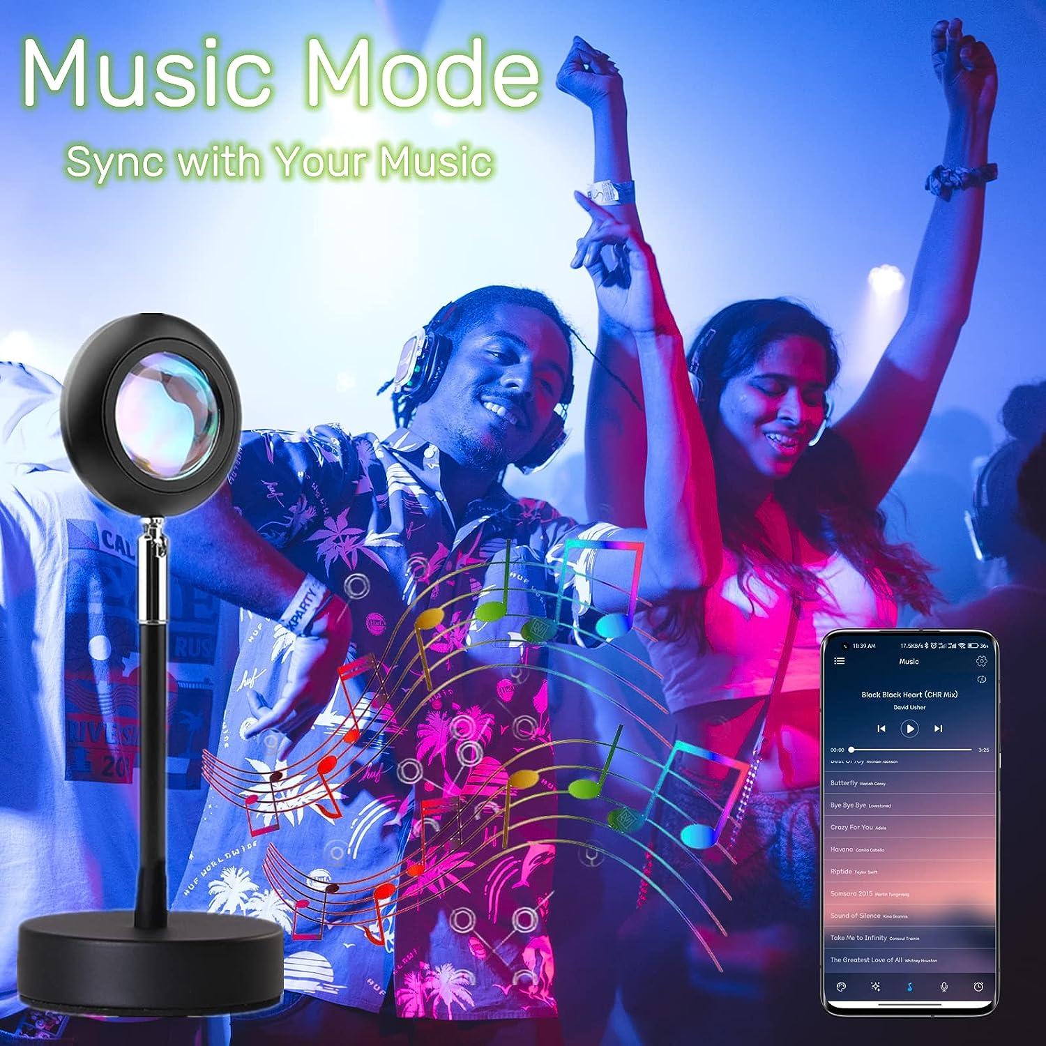 Notre lampe coucher de soleil, contrôlable via une application Bluetooth, se synchronisera avec votre musique après connexion à votre téléphone portable et réagira aux sons externes tels que la musique, les films et les jeux, transformant votre audio en un environnement lumineux coloré et immersif au rythme de la musique.