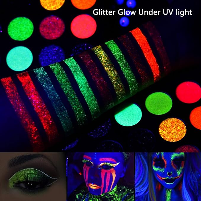 The way the glitter powders in "Beauty Queen" Palette are pressed make them intensely pigmented yet easy to blend. This eyeshadow palette comes with the unique addition colors , a shade that looks ordinary glitter color in its pan but transforms into a duo chrome glitter hue once applied.What's more: 11 Glitter colors glow in dark under uv light.